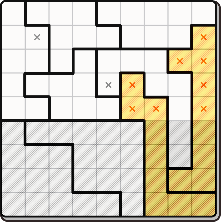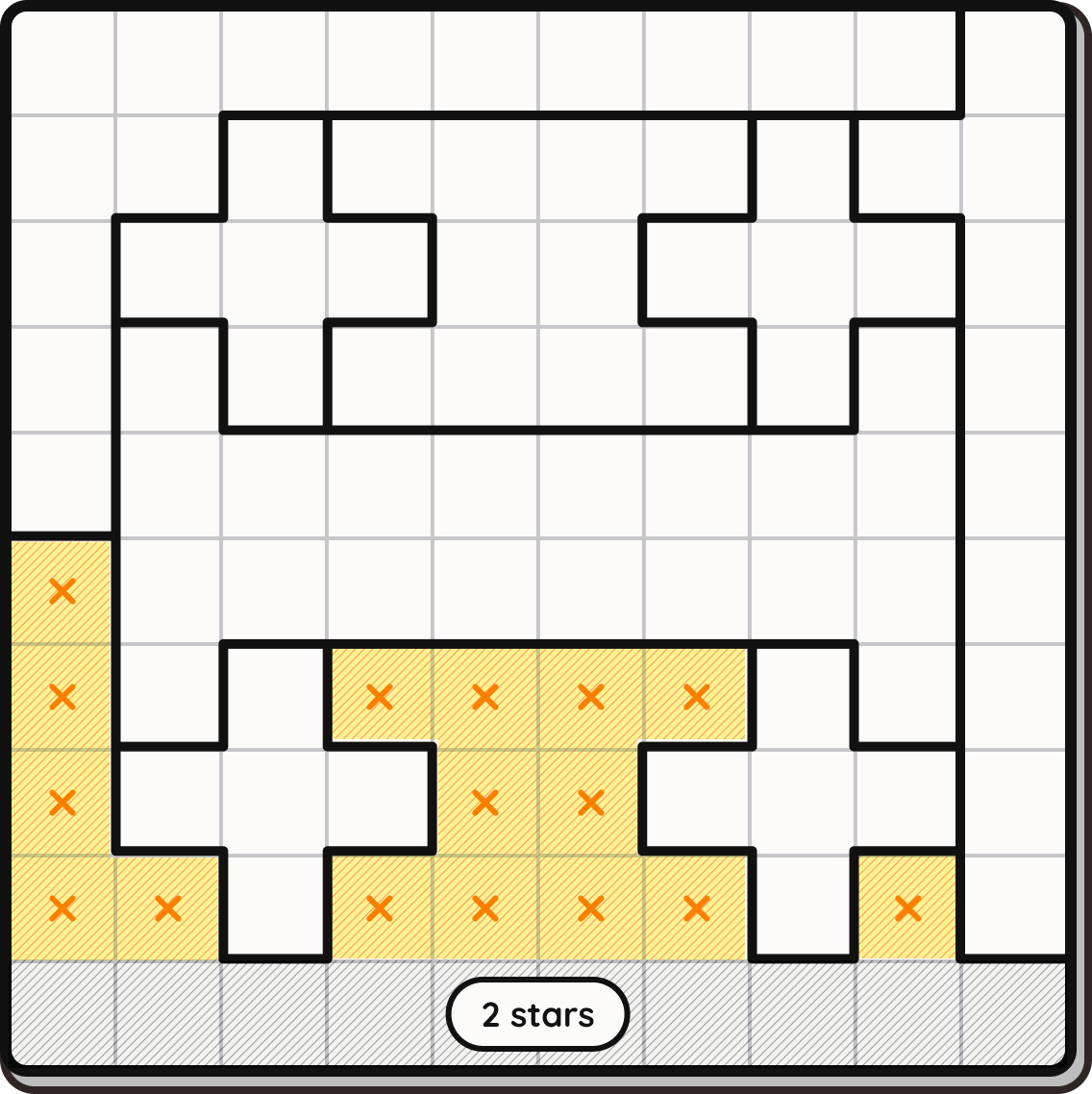 If a region includes an entire edge of the puzzle, the two stars for that row or column must be placed in the edge cells. Any cells in that region that are not on the edge can be safely marked with Xs.