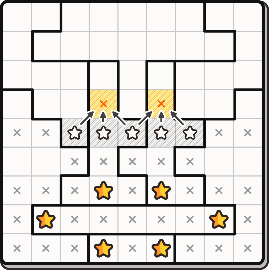 When a section of the puzzle can only place its required stars within a limited set of rows or columns, those rows or columns form a chunk. That chunk tells you exactly where stars must go (and where they cannot go).