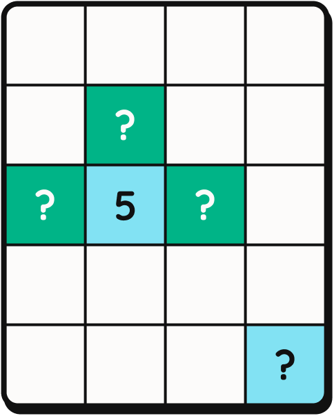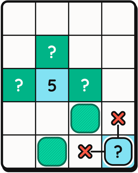 A different piece of logic to spot here is that at least one of these indicated cells must be part of the 5; They can’t both be green without violating the Budget. It doesn’t matter which cell is part of the 5, because in either case, the 5 will nearly be touching the blue [?] and must be separated by a green cell.
