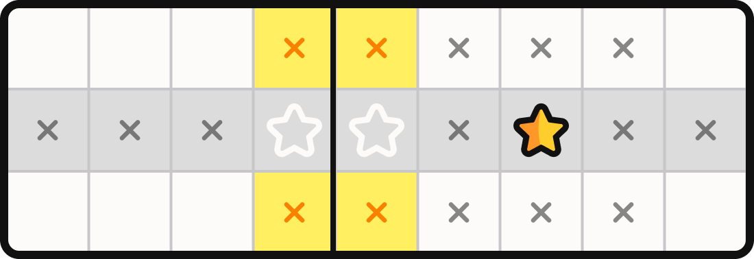 Tip No. 6. Always visualize the potential effect of a Star on its surrounding cells. In the example above, if a Star was placed where the X is located, it would cause the purple shaded cells to have an X. This would leave only two adjacent cells in that area, not enough room for the necessary two Stars, so you know a Star cannot be in that position. Place an X there as indicated by the yellow highlight.