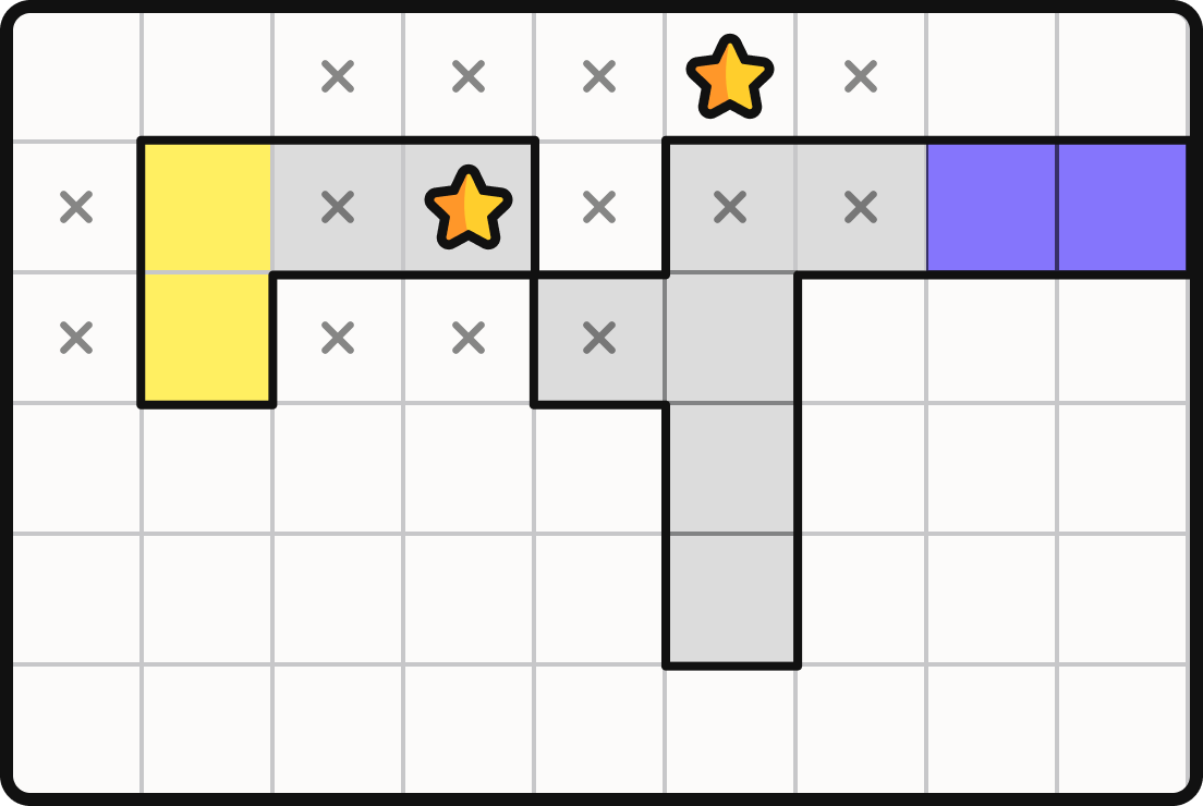 Tip No. 7 involves looking ahead. Looking ahead is simply mapping out the what-if of a decision to see how it interacts with the other rules and tips. In the above example, on the L-shape area, you know a Star has to go into one of the two highlighted yellow cells, but which one? If you place it in the top cell, that would fill that row with two cells, marking all other cells on the row with a X (purple shaded). That leaves only one cell in the region on the right to put a Star and every area must have two. Therefore, the Star cannot go in the top cell, it must go in the bottom highlighted cell.